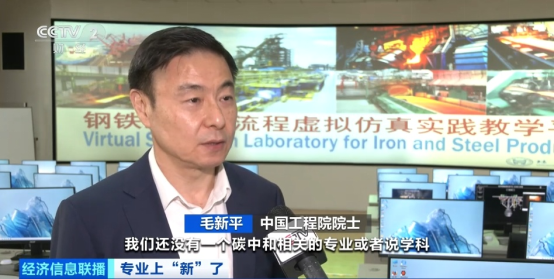 中国工程院院士 毛新平:要实现碳中和这个目标,它实际上是一个复杂的社会问题,有产业层面的,也有社会层面的,新专业从相关的基础科学研究到关键技术开发,到相关的企业的管理运营,以至于最后我们相关的碳经济和国际贸易等诸多方面都涉及。