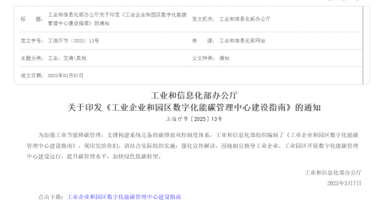 为加强工业节能降碳管理,推进数字技术赋能绿色低碳转型,支撑构建系统完备的碳排放双控制度体系,工业和信息化部近日印发《工业企业和园区数字化能碳管理中心建设指南》(工信厅节〔2025〕13号,以下简称《指南》)。为更好理解和落实《指南》,现就有关内容解读如下。