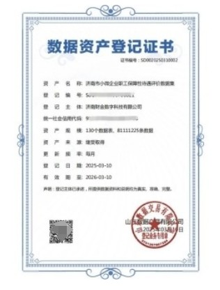 近日,山东数据交易平台正式向济南财金集团所属济南财金数字科技有限公司(简称“财金数科”)颁发“济南市小微企业职工保障性待遇评价数据集”数据资产登记证书,标志着济南成功完成首单基于公共数据开发的数据资产入表。