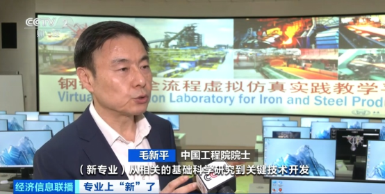 在北京科技大学的钢铁生产全流程仿真教学平台,中国工程院院士毛新平正在与同学们探讨关于钢铁行业碳排放的话题。2023年,毛新平院士就向教育部提出,建立碳中和科学与工程专业。